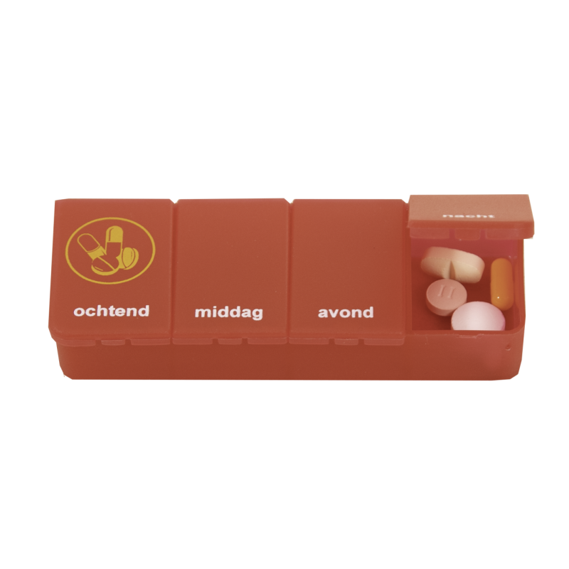 Deze handige pillendoos voor één dag heeft vier vakjes: ochtend, middag, avond en nacht.